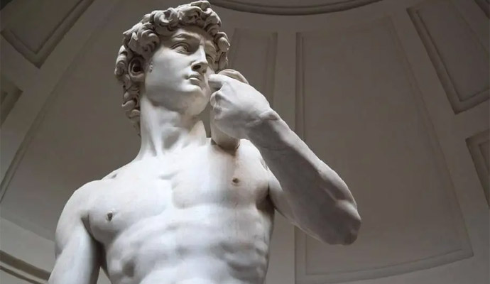 《大卫像》位于佛罗伦萨的圣母百花大教堂广场上,高达5.17米,是一座巨大的大理石雕像。这座雕像描绘了圣经中的大卫王,他手持弹弓,准备击败巨人歌利亚。
